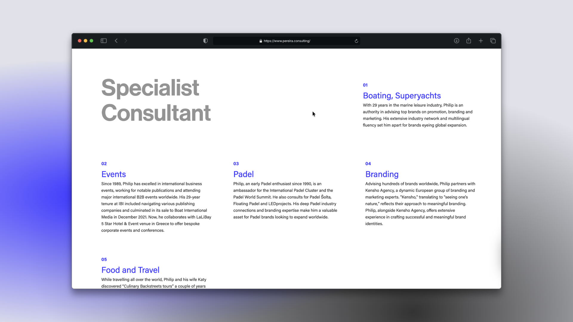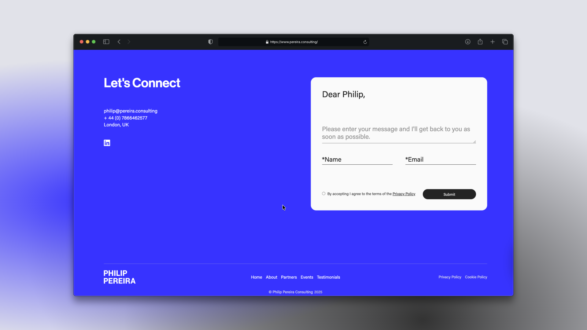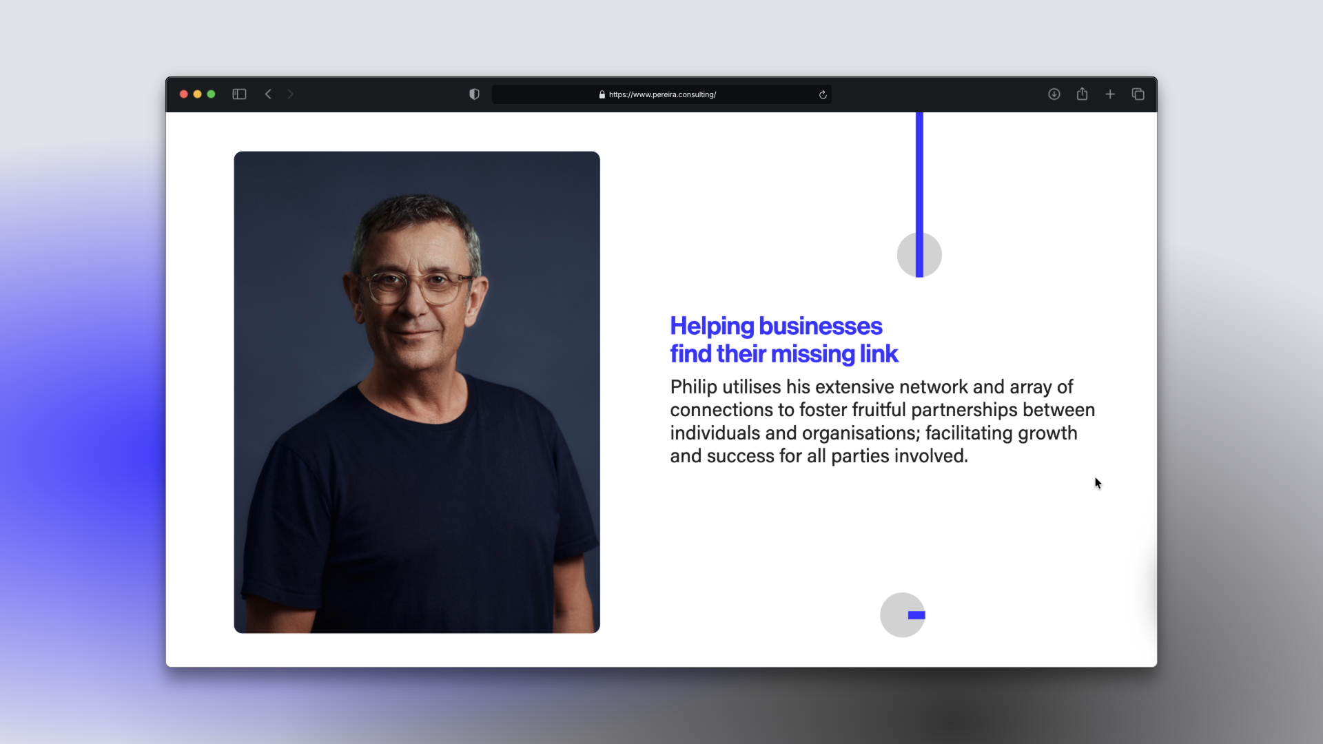 While at Kenshō, I built and developed a clean, professional landing page for business consultant Philip Pereira using Webflow. The page was designed to support his networking efforts, giving potential clients a simple way to connect and learn more after being introduced.